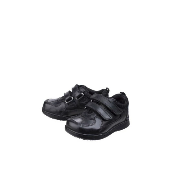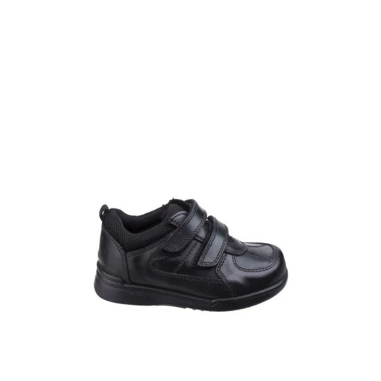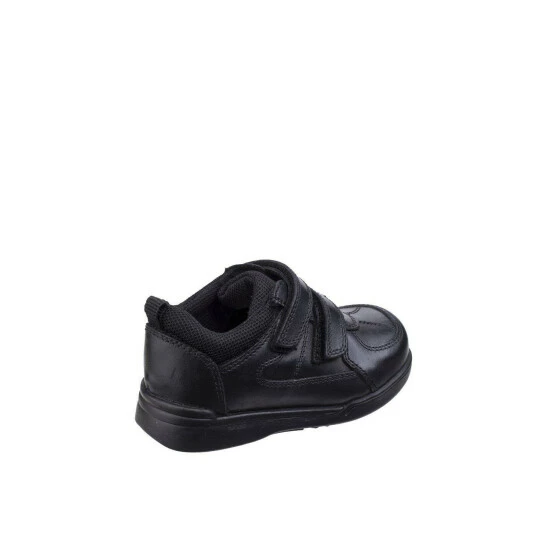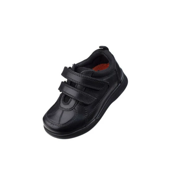 Durable boys school shoe with double touch strap fastening and adjustable fit left, fit right in soles for the perfect fit. A padded collar adds even more comfort. ‘Fit Left Fit Right’ is a unique fitting system which allows for 5 different width fittings for each individual foot. Every pair of shoes comes with 3 pairs of footbeds. Full grain leather uppers. Textile lining.